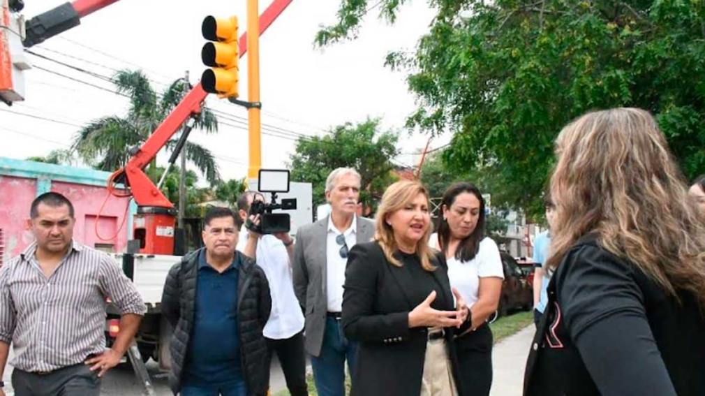 La intendente, Ing. Norma Fuentes, supervisó la instalación de nuevos semáforos en la esquina de las calles Libertad y Santa Fe, con el objetivo de mejorar la seguridad vial y optimizar la circulación del tránsito.